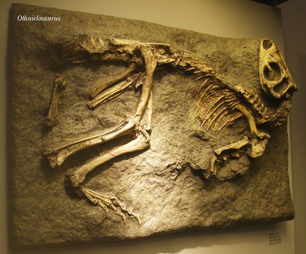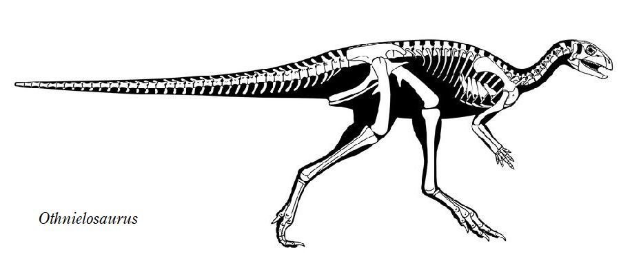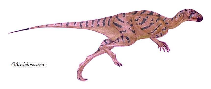 | オスニエロサウルスは、アメリカ、ワイオミング州、コモブラフ近くの採 石場のジュラ紀後期(約1億5600万年前)のモリソン累層から発見された。 属名は、オスニエル・チャールズ・マーシュに献名されたものである。二 足歩行の草食もしくは、雑食の小型恐竜である。化石は、体の全部分が 見つかっているが、頭骨は、不十分である。前肢は短く、長い後肢には、 筋肉が付着するための大きな突起があった。手は小さく、指は太く短かっ た。頬歯は、木の葉形の三角形で、歯状突起のある縁を持つ。単純な構造 の前上顎骨歯を持っていた。ヒプシロフォドンやテスケロサウルスのよう な、肋骨に沿って細いプレートがあった。これは、intercostal plates と呼ばれ、軟骨起源の構造である。分類上、ヒプシロフォドンよりも原始的 で、基盤的である。全長は、約2m、体重は、約10Kgと推定されている。 |