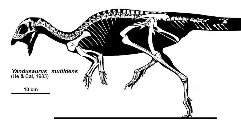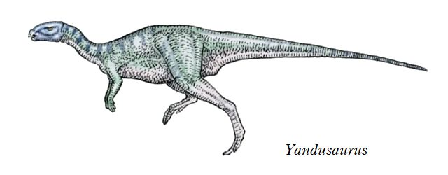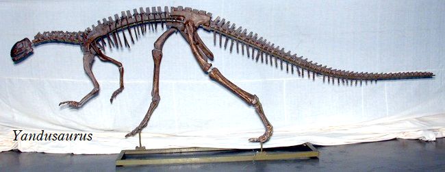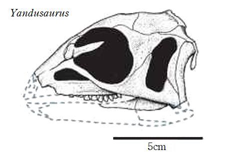 | ヤンドゥサウルスは、中国、四川省、自貢市、鴻鶴ダム近郊の金子凼での ジュラ紀中期(約1億6500万年前)の下部沙溪廟層(シャキシミアオ層)か ら、1973年に発見された。当時、建設作業中で、誤って恐竜の骨格を機械 により破壊してしまった。属名は、自貢の古名である塩都(Yandu)に由来 するものである。化石は、頭骨を含む部分骨格である。体の大部分の要素 が保存されており、頭蓋骨、脊椎、肩帯、前肢、後肢などが含まれていた。 ヤンドゥサウルスは、素早い二足歩行の恐竜で、足には各4本、手には各 5本の指があった。曲がった頬骨からは目が大きかったことが分かる。上 顎歯は、平行で垂直な隆起部を持ち、舌側が大きく磨り減っていた。全長 は、約3m、体重は、約140Kgと推定されている。 |