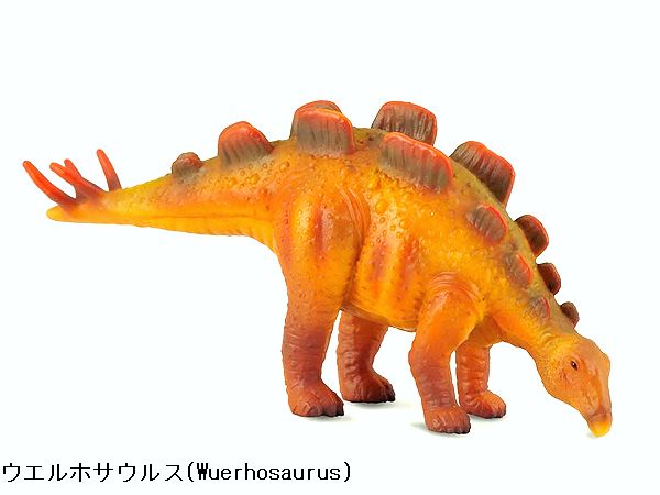 | 最後期の剣竜は、中国の新疆ウイグル自治区の白亜紀前期(約1億3000万 年前)のトゥグル層群から発見されたウエルホサウルス(Wuerhosaurus) で、体長7m、体重4tである。 |
