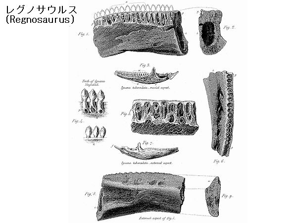 | 「サセックストカゲ」を意味するレグノサウルスは、イギリス、サセック ス、カックフィールドの白亜紀初期のタンブリッジウェルズサンド層で 発見された。3本の歯を含む右下顎骨片のみで、15本の歯のソケットが 見られ、長さ33cmある。体長は、推定で4mとされる。顎が非常に似て いるため、ファヤンゴサウルスに似た剣竜類であると結論付けられた。し かし、多くの研究者は、不明または疑わしい名前としている。 |