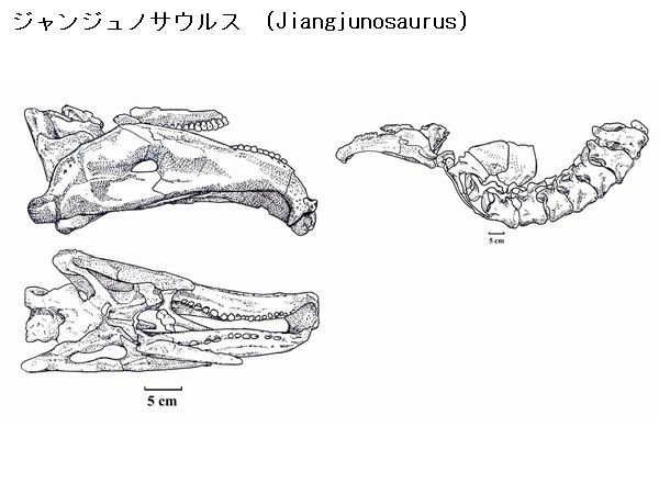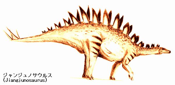 | ジャンジュノサウルスは、中国、新疆ウイグル自治区ユングガル盆地のジ ュラ紀後期のシシュゴウ累層から発見された。化石は、下顎骨、後部頭蓋 骨、軸椎骨、後部頸椎骨、肋骨、肩甲骨、烏口骨、および2つの首のプレ ート(骨板)であった。中型の剣竜類で、体長6m、体重は2.5tと推定され た。亜成体個体であった。ステゴサウルス科内では基底的な位置にあると 結論付けた。 |