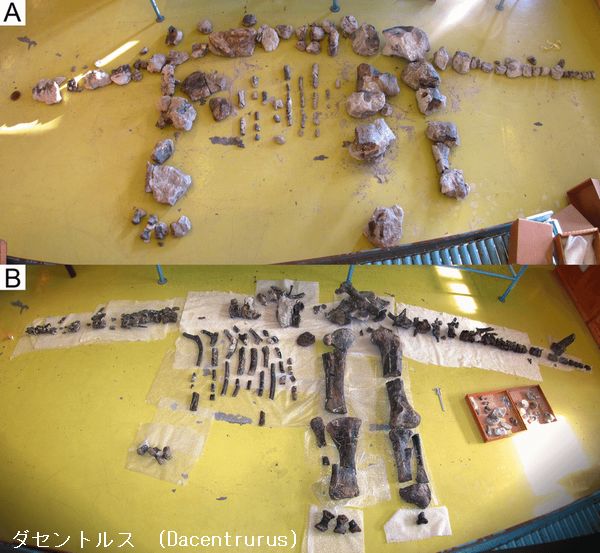 | アフリカ大陸タンザニアのジュラ紀後期のテンダグル累層で、ドイツ遠征 隊が大量のケントロサウルスの化石を発見したが、第二次世界大戦でほと んどが破壊された。多個体の部分骨をつなぎ合わせた1体の骨格が存在す る。小型の剣竜類で、体長は4~4.5m、体重は700~1600kgに達した。 仙骨に7個の椎骨がある。全長の半分強が尾で構成されている。頭蓋骨・ 下顎骨の部分骨は、8体分が見つかっている。完全な頭蓋骨は、見つかっ ていない。口は角質のクチバシとなっている。狭い鼻と小さな歯は、ステ ゴサウルスに似ている。7対の小さなプレートが、首と背中に沿って並び、 肩に長いスパイクが1対、腰から尾にかけてスパイクが対に並んでいた。 |