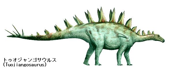 | 中国、四川省のジュラ紀後期、上部シャキシミアオ累層で発見された。 トゥオジャンゴサウルスは、「沱江(揚子江の支流)のトカゲ」という意 味である。大型の剣竜類で、長さは6.5m、体高は約2m、体重は約4t。 初めて発見された肩に棘のある剣竜類である。他の剣竜類より頭部を 低く保ちやすい構造になっており、地面近くの植物を食べていたと考え られている。 |