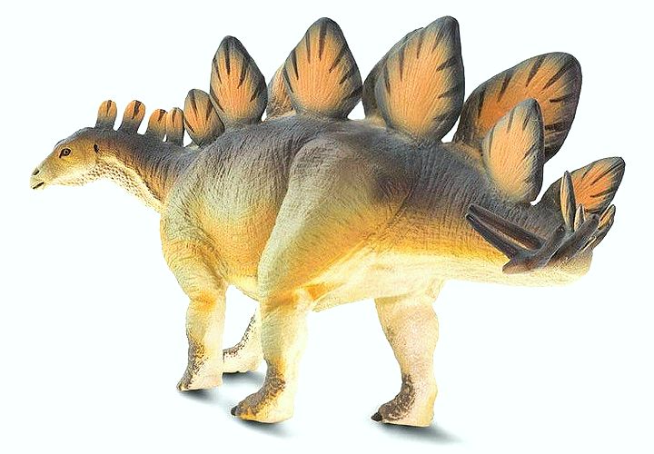 | ステゴサウルスの化石は、アメリカ西部とポルトガルのジュラ紀後期の地 層から発見されている。コロラド州のモリソン層からは多量の化石が産出 している。有名なのは、ワイオミング州、レッドキャニオン採石場から、 85%が無傷に保存された、全身骨格が発見されたもので、「ソフィー」( Stegosaurus stenops)と名付けられ、ロンドン自然史博物館に収蔵さ れている。背中に骨質の板(プレート)が、互い違いに立ち並んでいるのが 特徴。17から22の別々のプレートと平らな棘からなる真皮プレートがあ る。最大のプレートは腰の上にある。これらのプレートは、表面と内部に 多くの血管の跡と思われる痕跡があり、熱を放射し体温を調節するのに役 立っていたとする説が有力である。仙骨には、4個の仙椎がある。仙骨の 前方には、10個の頸椎と17個の胴椎があった。仙骨の後方には、46個の 尾椎骨があった。頭は小さく、脳のサイズはクルミ程度である。尾の棘は 4本である。体長は、7~9m、体重は、約4tである。 |