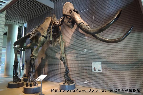 | 写真は、茨城県自然博物館の松花江マンモス (Mammuthus trogontherii sungari)の全身骨格。 トロゴンテリゾウ(Mammuthus trogontherii zhalainuoer)、アジアステップマンモスとも呼ばれ る。中国で発見された世界最大級のマンモスで、体長 9.1m、高さ5.3m、推定体重は、10tもある。1980年に 中国の内モンゴル自治区のザライノールの露天堀鉱山 から発見されたもので、今から34,000年前頃の最終 氷期に生きていた。 |