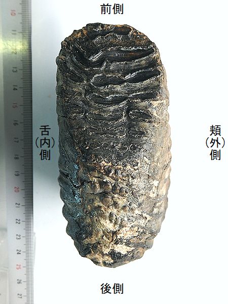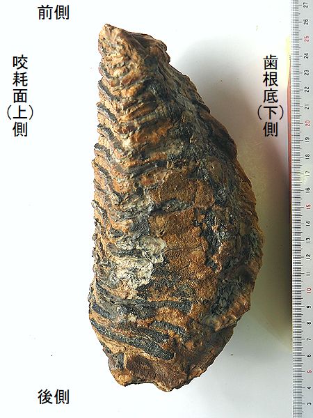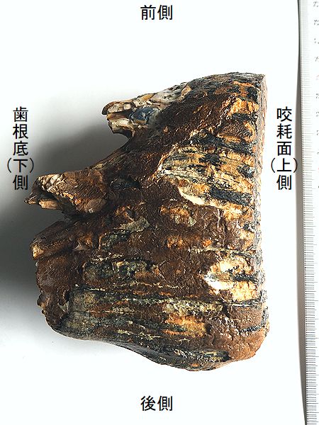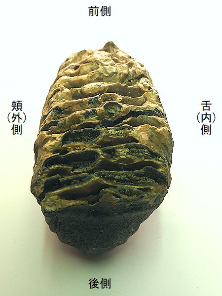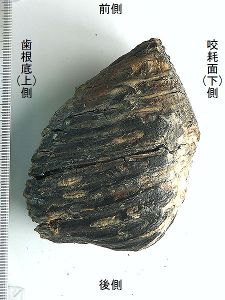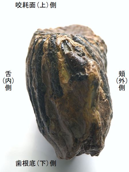 第10回東京国際ミネラルフェア(新宿 ショー)で、Simon Cohen Fossils より購入。ラメラが咬耗面とほ ぼ直角で交わり、咬耗も進み、 咬耗面も凹んでいるので、下顎 の歯である。歯冠長や幅が小さ いので、5歳から10代の若い個 体の歯だとわかる。側面がセメ ント質で被われ、歯根も発達し ている。咬板(ラメラ)の枚数が 13枚であることから、下顎右第 1大臼歯と思われる。 |