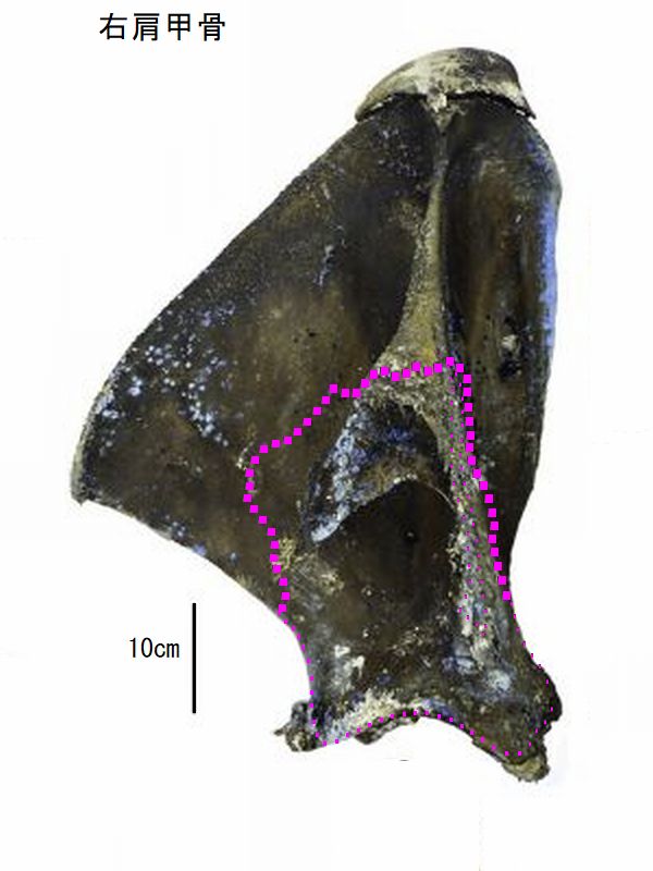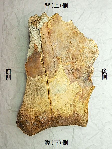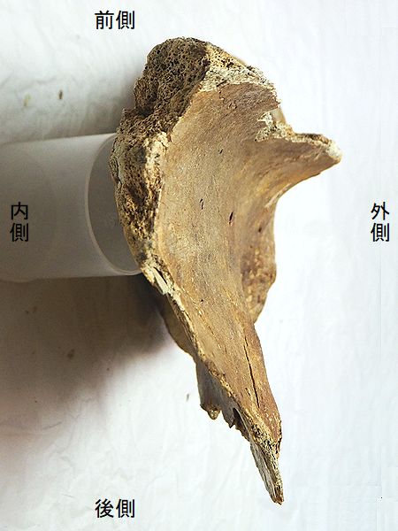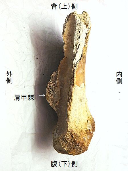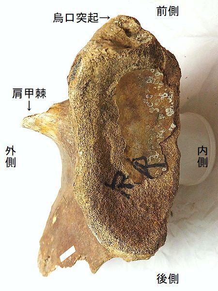 ヤフーオークションで購入。 右肩甲骨の下半分の部分化石で ある。上腕骨との関節部分であ る関節窩も保存され、烏口突起 も折れているが、穴が見える。 肩甲棘も高く保存されているが 、肩峰は、欠如する。劣化があり 、表面が剥がれやすくなってい る。 |