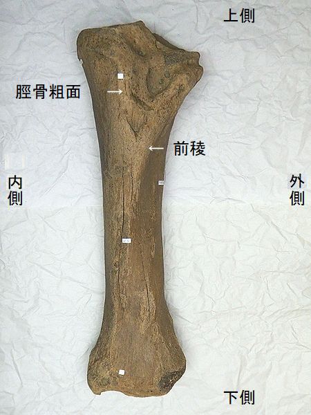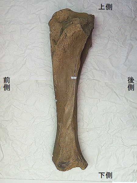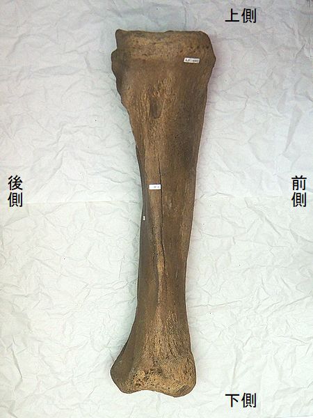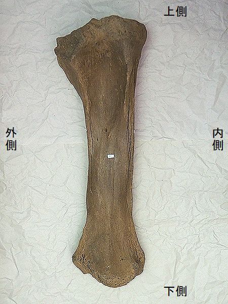 ヤフーオークションで購入。 左脛骨のほぼ完全な標本。関節 面も骨全体の表面もよく保存さ れている。わずかに、上下端の 角が欠けていたり、摩耗してた りする。 |