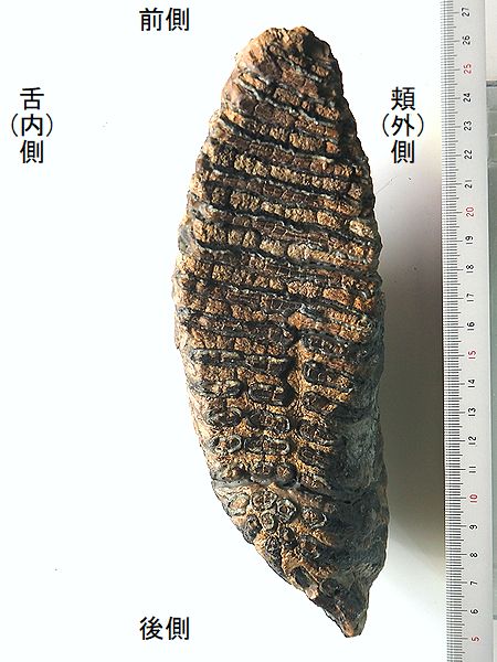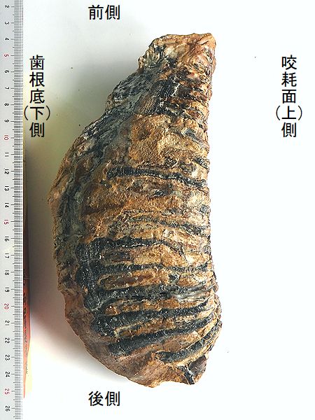 ヤフーオークションで購入。 ラメラが咬耗面とほぼ直角で交 わり、 咬耗面も凹んでいるので、 下顎の歯である。後半部の咬耗 があまり進んでおらず、ラメラ のエナメル質が連続しない。ラ メラの枚数が17枚で、枚数の割 に歯冠長や幅が小さめである。 メスかもしれない。30代から 40代の個体の歯と思われる。 頬側から見ると半月状なので、 下顎右第3大臼歯と思われる。 |