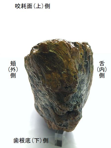第10回東京国際ミネラルフェア(新宿 ショー)で、Simon Cohen Fossils より購入。咬耗面が狭く、咬耗が ほとんど進んでいない。歯根も 未発達である。ラメラが咬耗面 と55°で交わことから、上顎の歯 である。大きさから、幼体の歯だ とわかる。咬板(ラメラ)の枚数 が10枚で、最後のラメラも割れ ていたり、もっとありそうであ る。よって、萌出したての上顎 右第4乳臼歯と思われる。 |