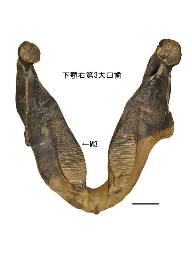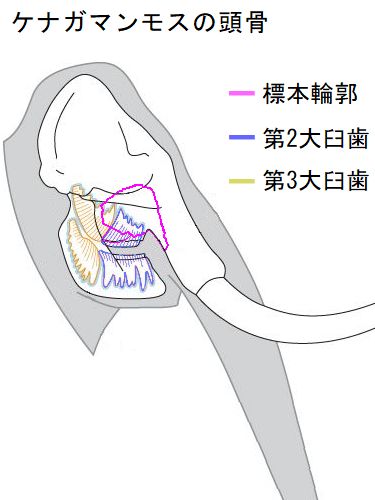 ケナガマンモスの下顎、成長段階(異なる個体)の図。下顎骨の成長とともに、後から前へ押し出すように 大臼歯が出てくる。13歳の図では、M1(第1大臼歯)の前に2つの穴が空いている。これは、DP4(第4乳 臼歯)の歯根が入っていた穴である。生きているときには、DP4は付いていた。化石化の過程で脱落した と思われる。53歳以上の図のM3(第3大臼歯)が最後の歯で、60歳ぐらいでこれが脱落したら、植物を噛 みつぶすことができないので、飢餓状態になり死に至る。 Diego Alvarez-Lao and Marcos Mendez,の論文「Ontogenetic changes and sexual dimorphism in the mandible of adult woolly mammoths」 Geobios,2011,vol.44,335-343p より改編。 |