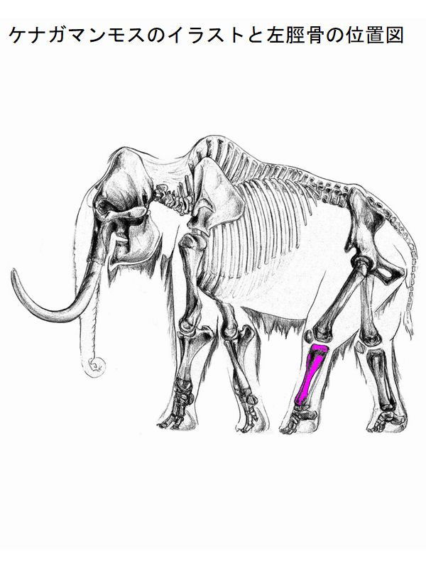 ケナガマンモスの復元全身骨格図。地面から肩までの高さが3.5mほどで、マンモス属の中では 平均的な大きさである。現在のアフリカゾウより一回り小さい程度の大きさである。背中を横か ら見ると肩の部分が高く盛り上がり、腰の部分にかけて低くなる。ケナガマンモスの特徴的な 大きくカーブした長い切歯(牙)は、武器ではなく草の上に積もった雪をはらったり、氷を持ち上 げたりしたと考えられている。一番長いものだと4mあった。重い牙を支えるために、頭の骨が後 ろの方に尖っていて、強力な筋肉が付いていた。 |