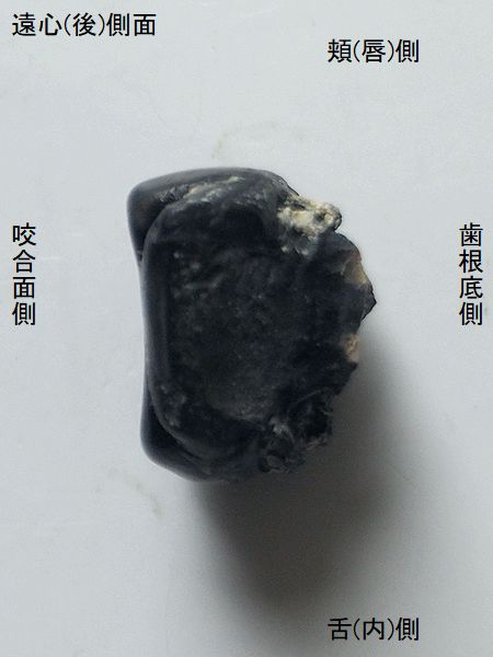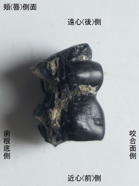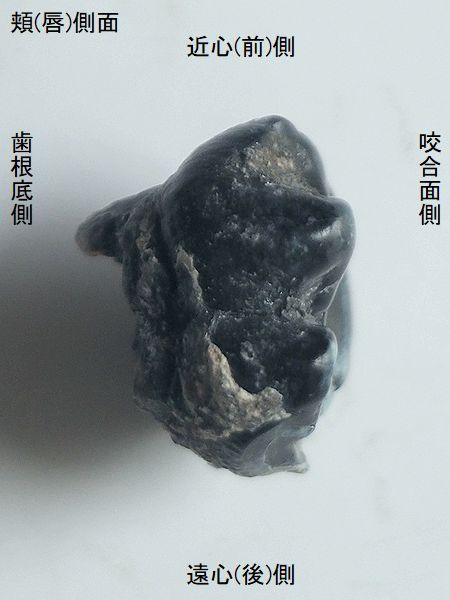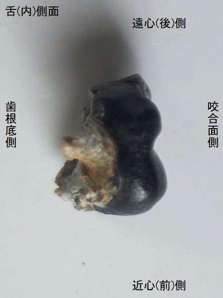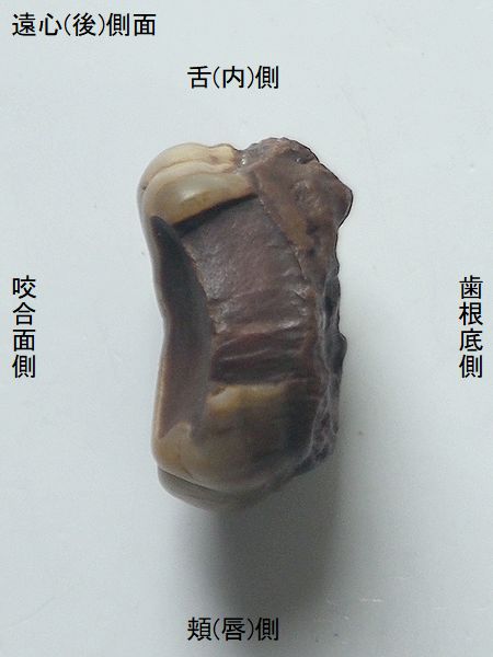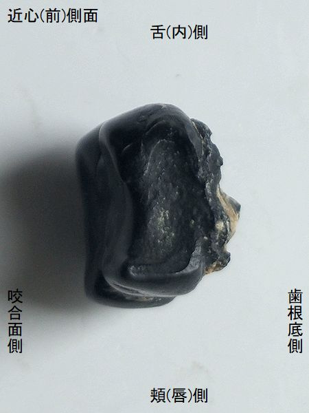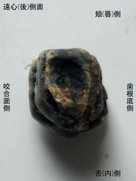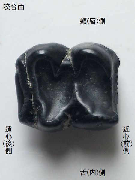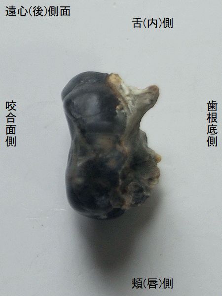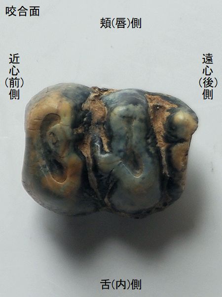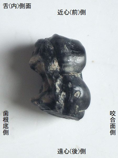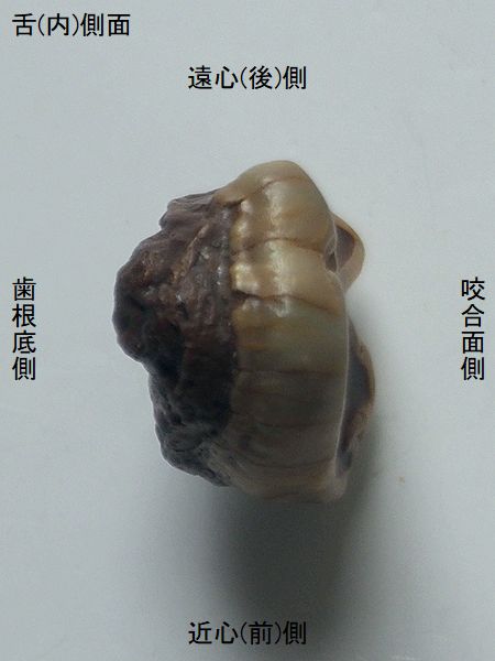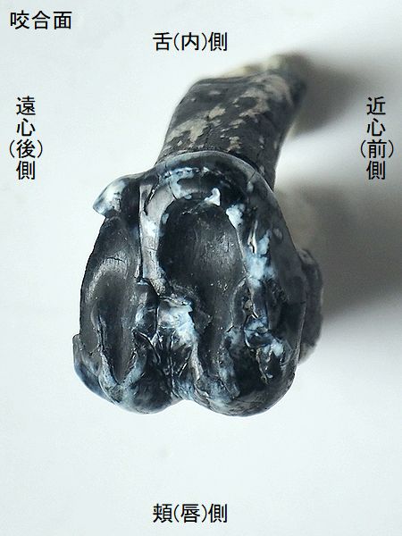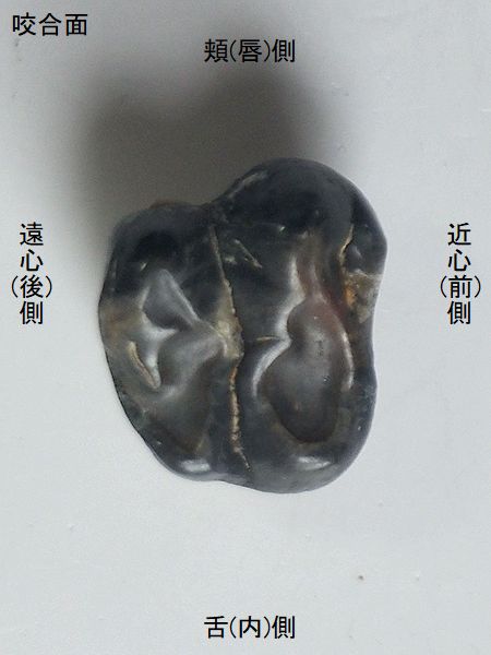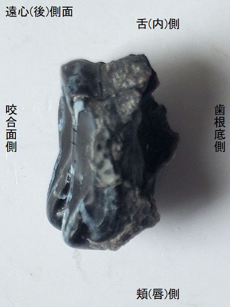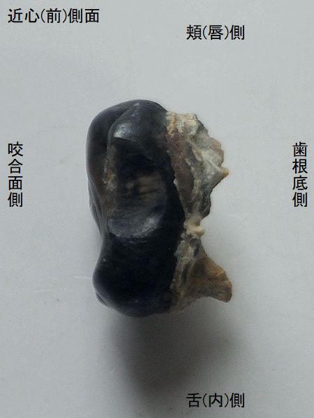 ヤフオクで、R.Hさんより購入。 咬合面の摩滅が不均等で、舌側半 分がより摩滅している。頬側は、 丸く盛り上がる。歯根底は、3本 の歯根が盛り上がる。歯冠は、黒 色がかり、完全で小さい。歯根側 の象牙質は白色である。歯頸部が 明瞭である。舌側面と頬側面の歯 冠は、2本の咬柱に見え、間がく びれている。頬側は、2つの咬柱 間が深く切れ込んでいる。遠心側 の咬柱の方が、かなり小さい。 |