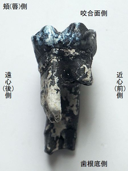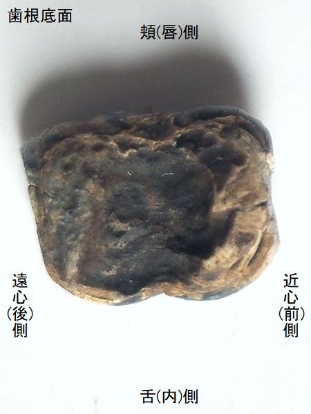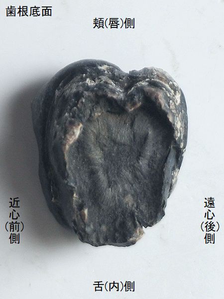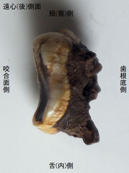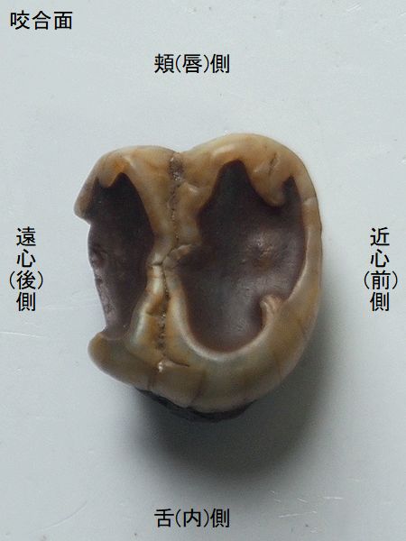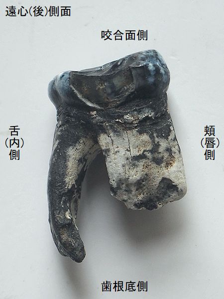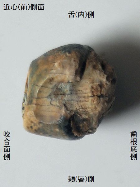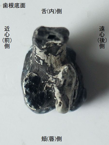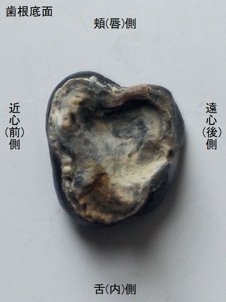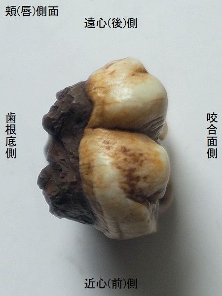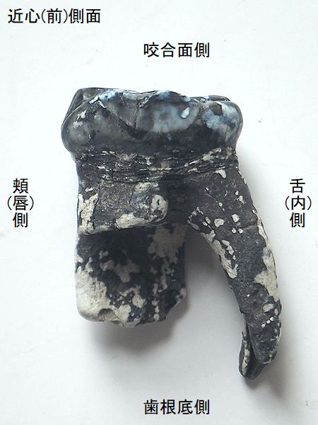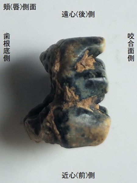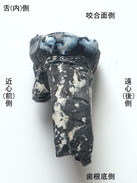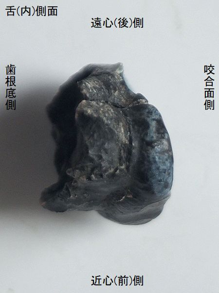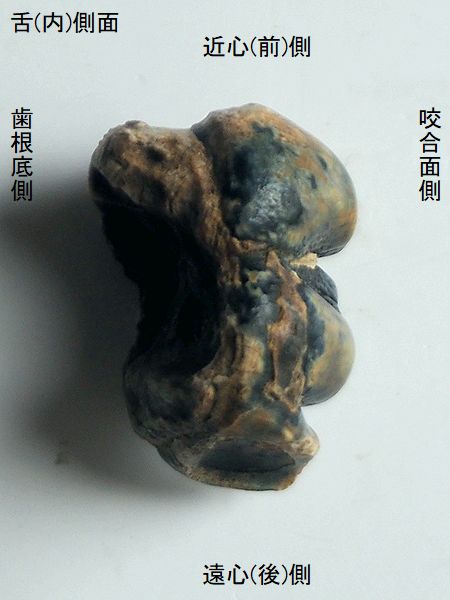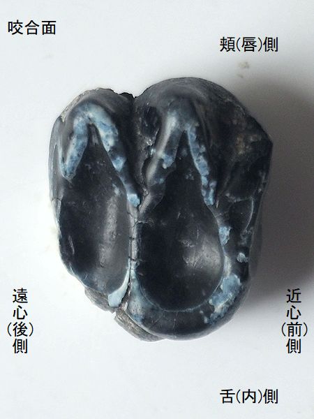ヤフオクで、R.Hさんより購入。 咬合面の摩滅が不均等で、舌側半 分がより摩滅している。頬側は、 丸く盛り上がる。歯根底は、3本 の歯根が盛り上がる。歯冠は、黒 色がかり、完全で小さい。歯根側 の象牙質は白色である。歯頸部が 明瞭である。舌側面と頬側面の歯 冠は、2本の咬柱に見え、間がく びれている。頬側は、2つの咬柱 間が深く切れ込んでいる。遠心側 の咬柱の方が、かなり小さい。 |
