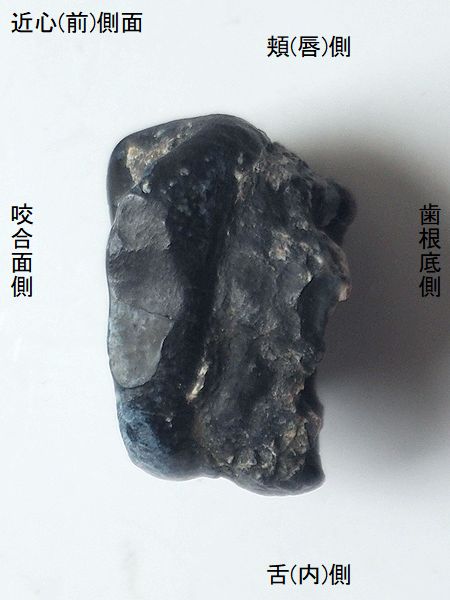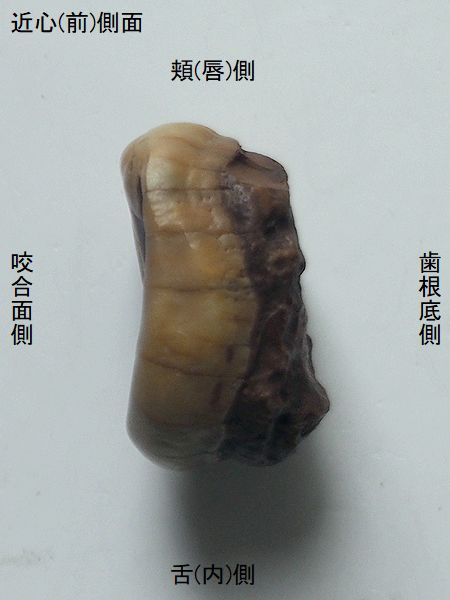 ヤフオクで、R.Hさんより購入。 咬合面がかなり摩滅している。近 心縁が特に摩滅。歯根底は、歯根 の根元だけがわずかに残り、遠心 側の歯根部が出ている。内部は えぐれている。歯冠は、ほぼ完全 である。上顎と違い遠心側に突起 (3咬柱目?)がある。エナメル質・ 象牙質は黒色である。歯頸部が明 瞭である。舌側面と頬側面の歯冠 は、2本の咬柱が見え、間がくび れている。 |