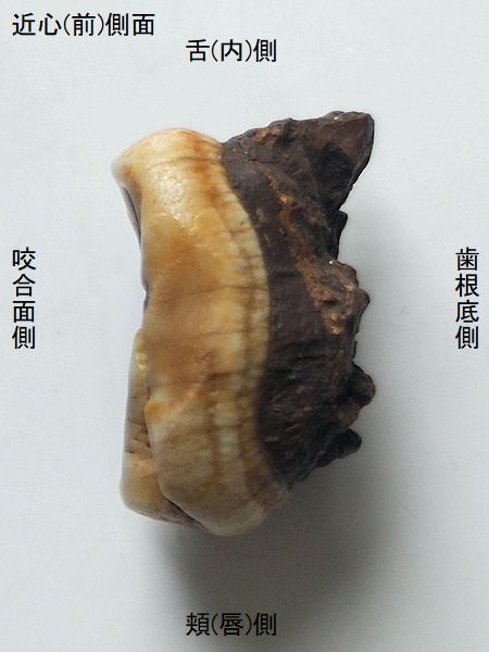 ヤフオクで、R.Hさんより購入。 咬合面のエナメル質が長楕円形と なり、摩滅が少ない。2本の咬柱 間がえぐれている。歯根底は、近 心縁と遠心縁の部分だけ歯根の根 元がわずかに残り、突出ている。 内部はえぐれている。歯冠は、ほ ぼ完全である。上顎と違い遠心側 に突起(3咬柱目?)がある。エナメ ル質・象牙質は灰褐色である。歯 根底は黒色で、タンニンの影響の ようだ。歯頸部が明瞭である。 |