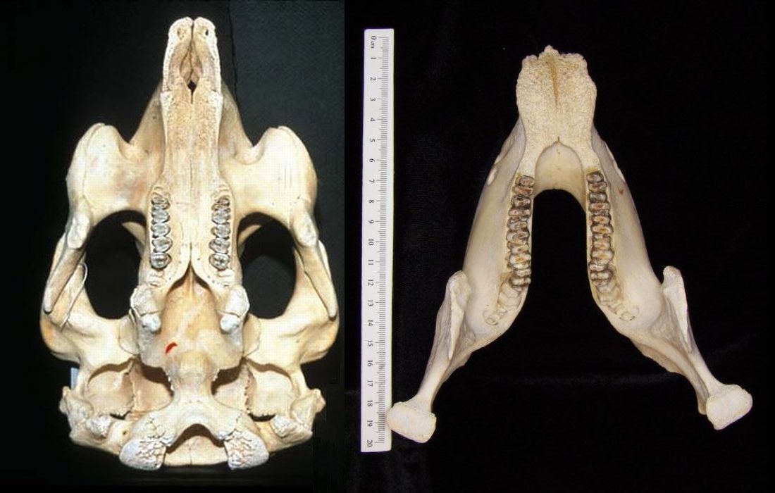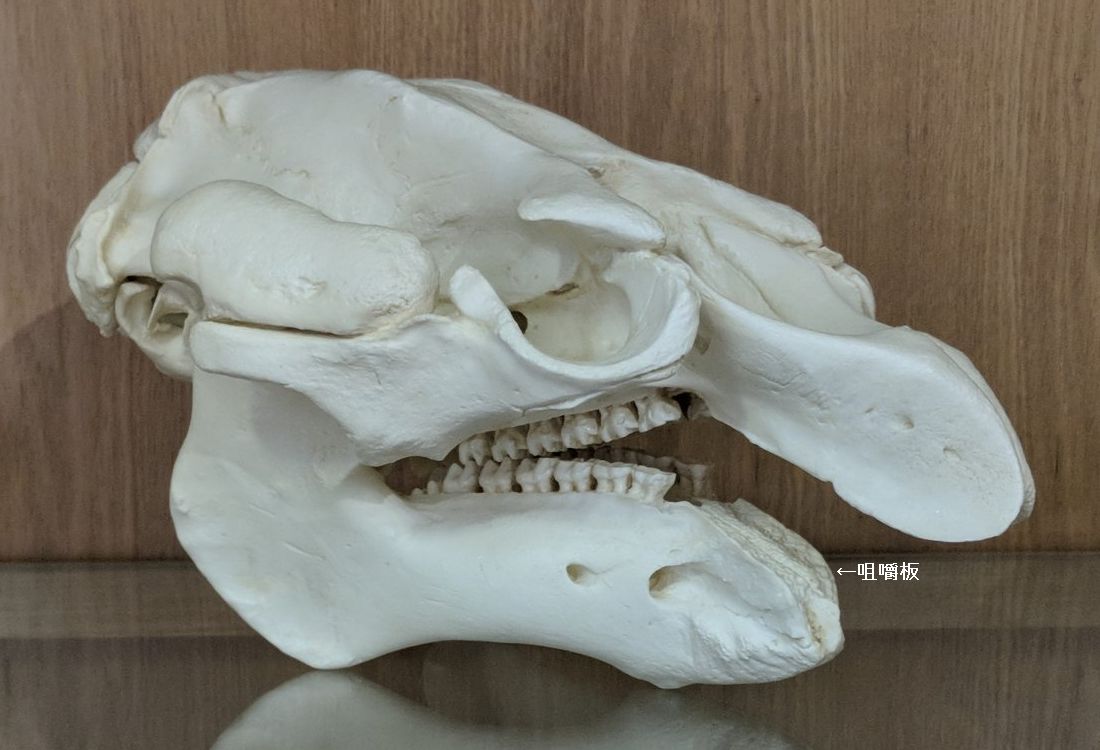 | 現生フロリダマナティー(Trichechus manatus latirostris)の頭蓋骨。下顎骨の咀嚼板(そしゃくばん)が 見える。奥の上下顎歯の噛み合わせがよくわかる。 |
