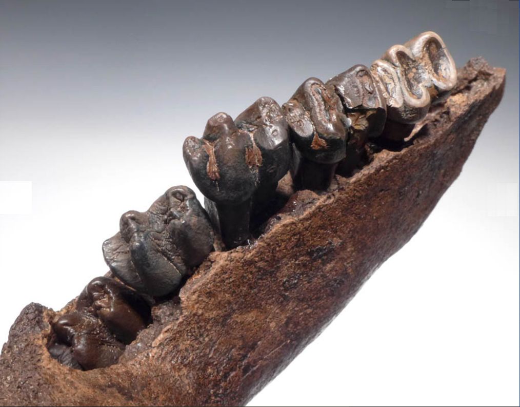 | フロリダ産の化石マナティーの下顎と歯である。上顎の 大臼歯は、左右に伸びた咬柱の列が2列だが、下顎の大 臼歯は、3列あり、遠心側の3列目は、小さい。上下顎 歯の区別をする大きな特徴である。上顎歯の歯根は、舌 側に1本、頬側に2本ある。これによって、左右がわか る。下顎の歯根は4本で、遠心側の方が短い。歯根は、 近心側に移動するにつれ、歯根の先端から顎の骨に吸収 されていき、抜けやすくなっていく。 |