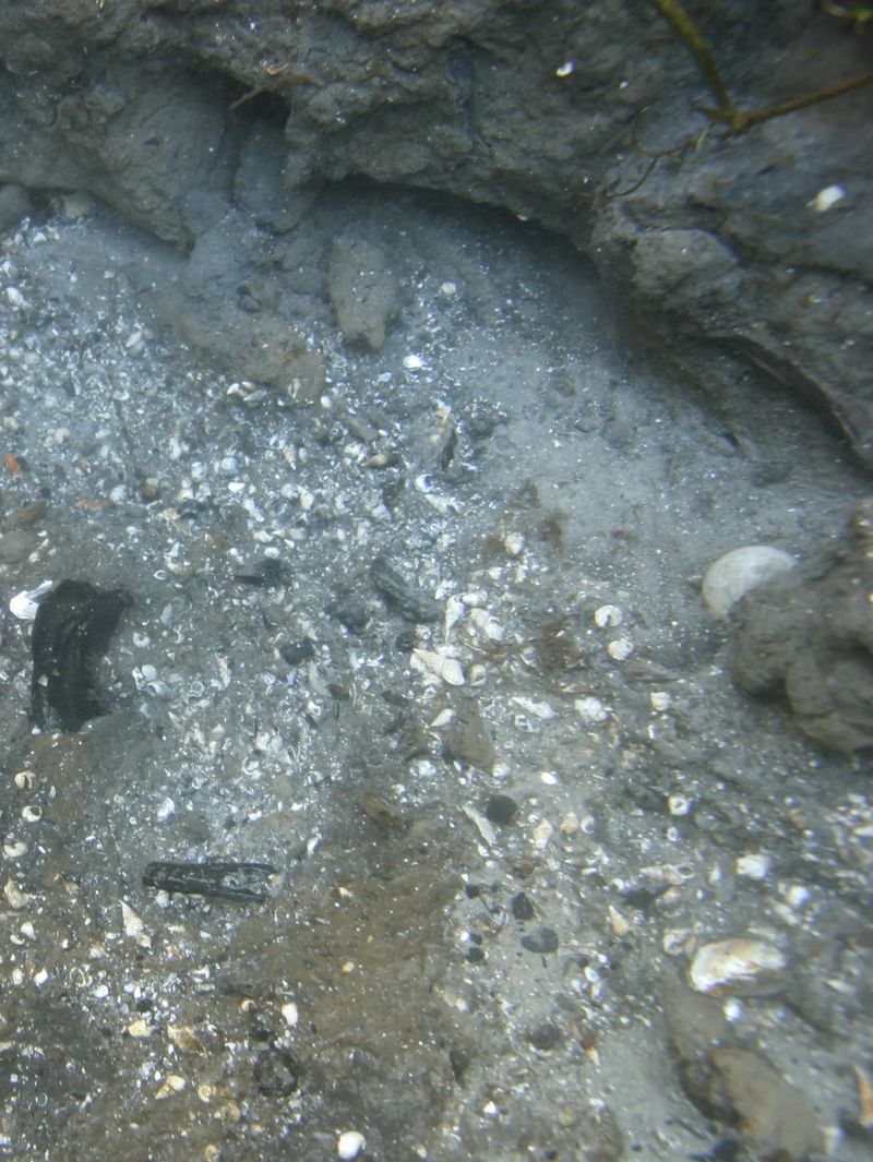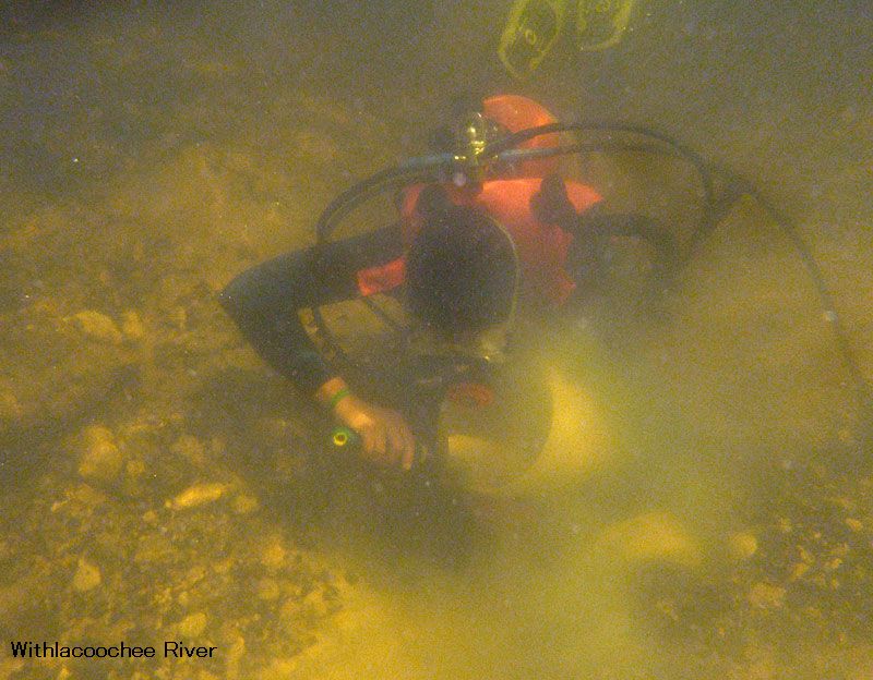 | ウィトラクーチー川の河床から、潜水して化石 を見つけ出す。水が濁っているので、照明は必 須である。 |