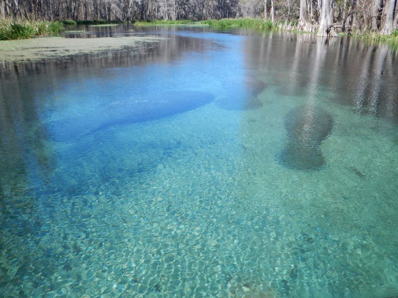 | フロリダ北部のコロンビア郡を流れるサンタフェ川(Santa Fe River)、フロリダマナティーが泳 ぐ。石灰岩地帯を流れるため、地下の鍾乳洞から湧き上がる泉が点在し、水温が一定している。 冬は、暖かいので泉の周辺にマナティーが集まる。 |