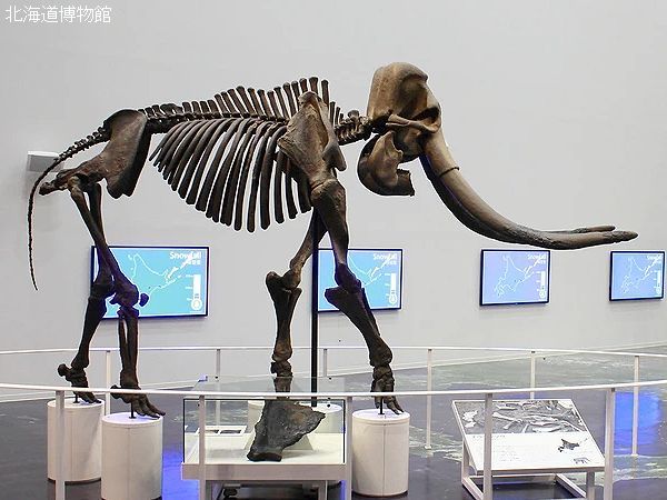 | 写真は、札幌の北海道博物館のナウマンゾウ全身骨格。 およそ12万年前に本州から北海道に渡ってきた。 1969(昭和44)に忠類村(現在の幕別町)で、1頭分の 化石が発見された。これは、年を取った個体で、オスで あると考えられている。 |