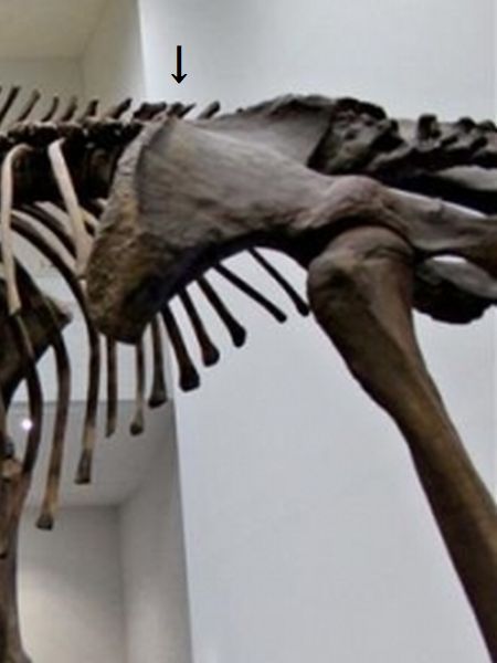 ヤフーオークションで購入。 海上がりの化石にしては、貝殻 等が付着しない。内部の石化が 進んでおらず、軽い。通常折れ 易い関節突起や横突起が残って いる。地層から掘り出されたも のか?北極海周辺の地層から出 るマンモスかもしれない?棘突 起の厚さが薄く、長さも短そう なので、胸椎の最後位、第18~ 20胸椎あたりと思われる。 |