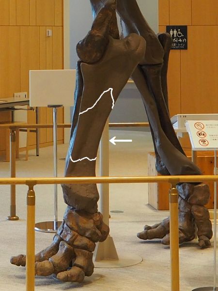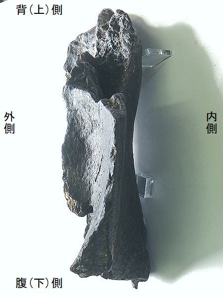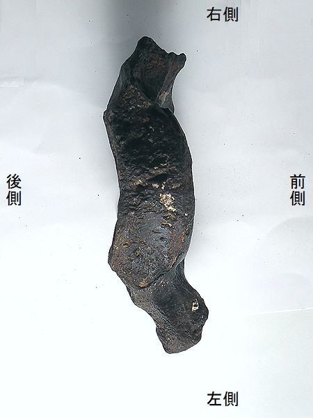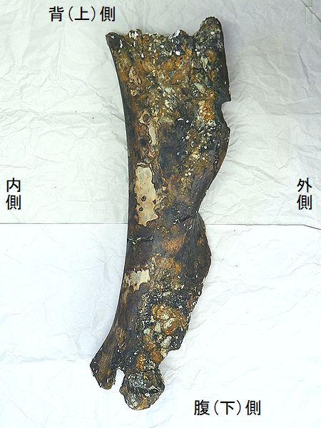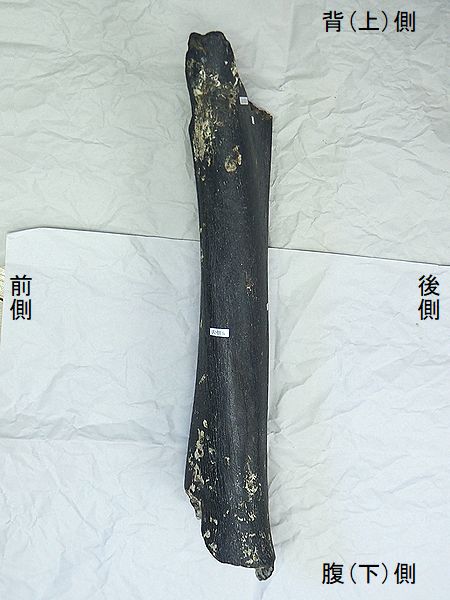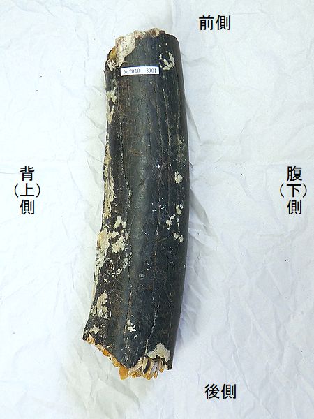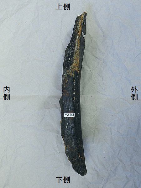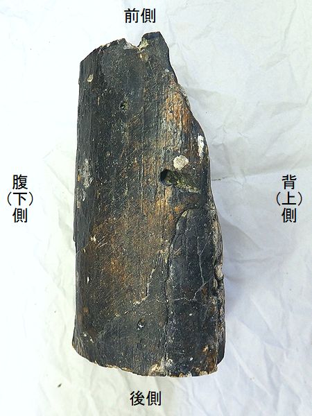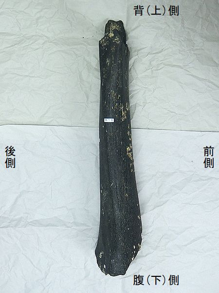 ナウマンゾウ 右大腿骨 Palaeoloxodon naumanni 兵庫県明石市明石海峡大橋付近 第四紀更新世・30万年前 播磨層群明石累層 長さ:483mm、幅:150mm、 厚さ:77mm、 重さ:2.7Kg |