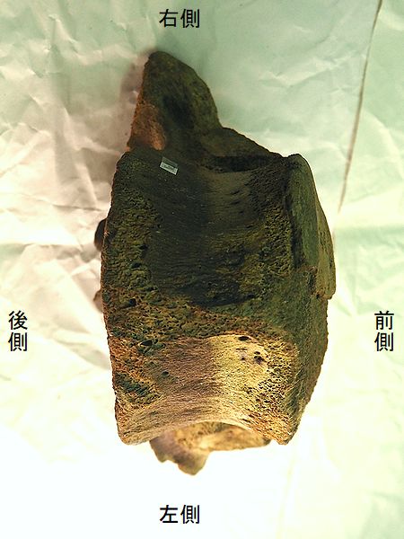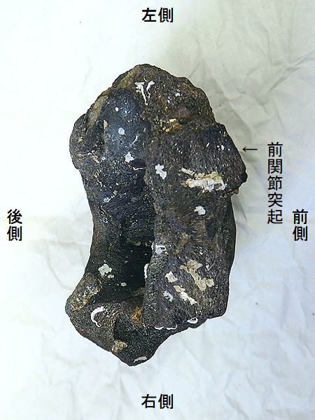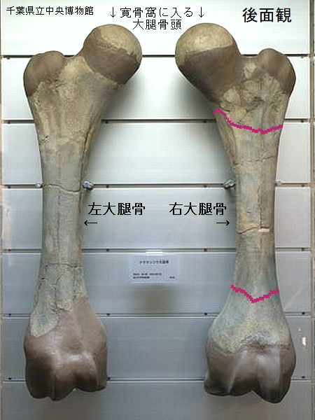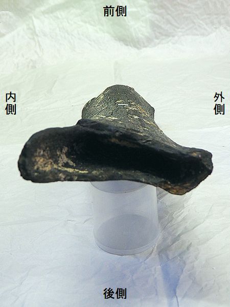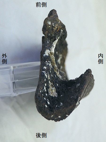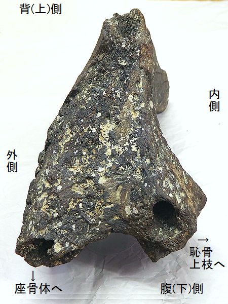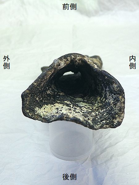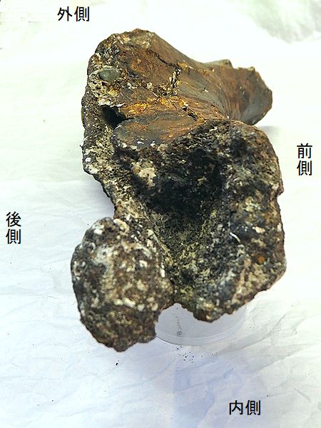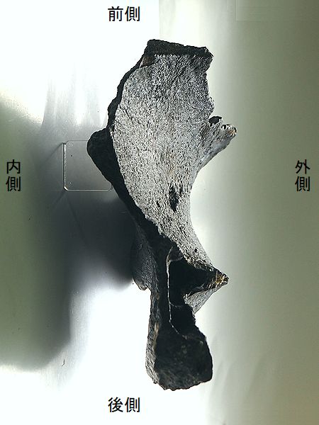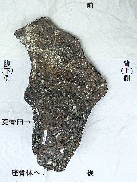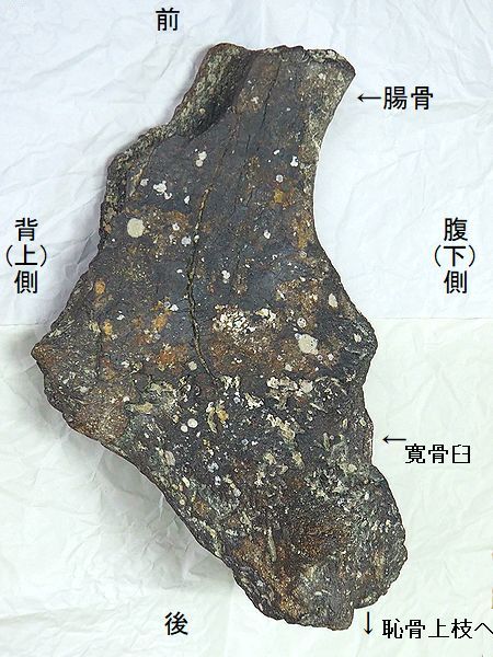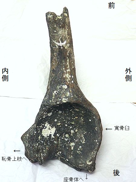 ヤフーオークションで購入。腸 骨の前中部と座骨大部分、恥骨 の大部分を欠く。(部位図参照) 摩滅が進んでおり、表面に凹凸 が多い。カキ等がかなり付着し ていたが取り除く。寛骨臼の直 径は、約160mmあり、かなり成 熟した個体のものと考えられる。 |