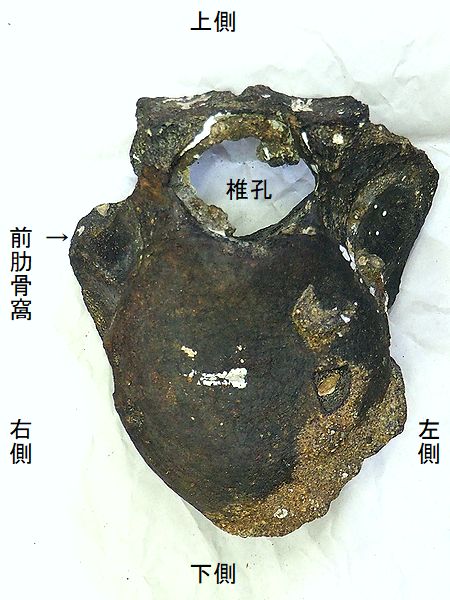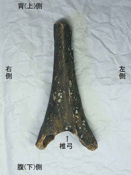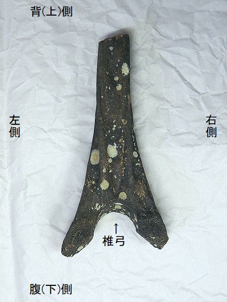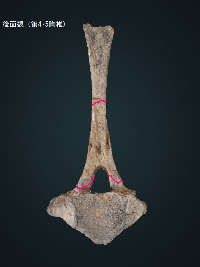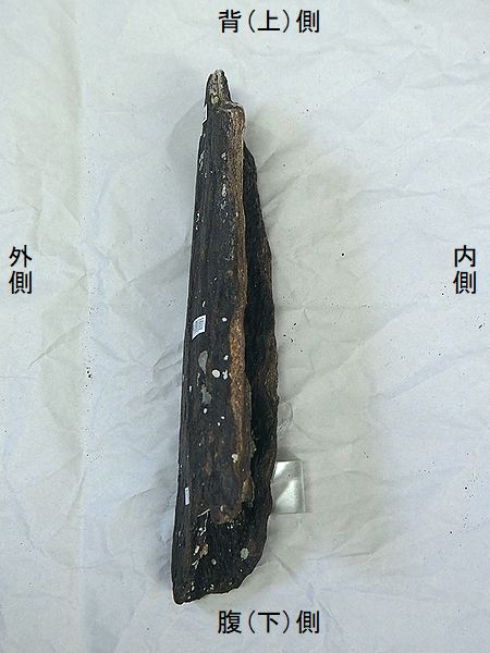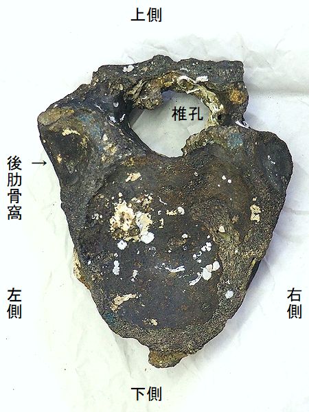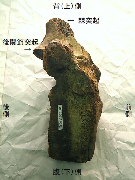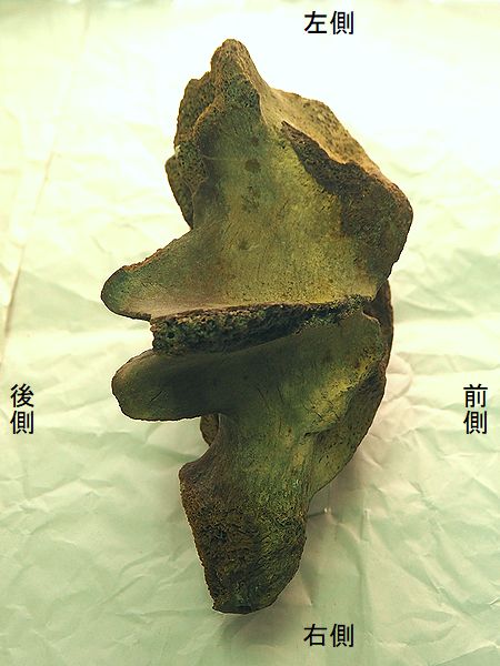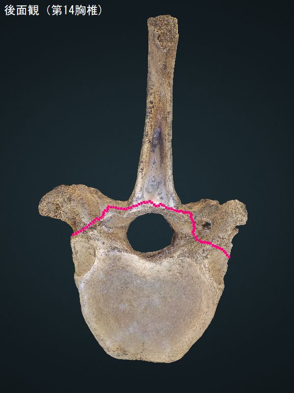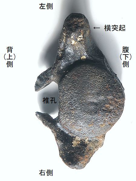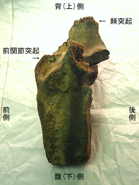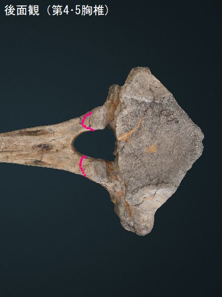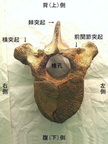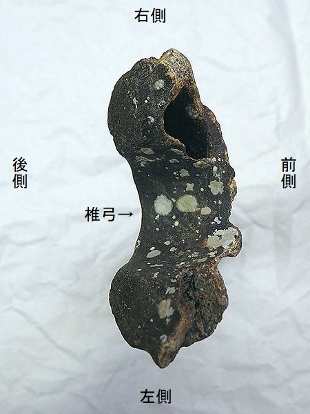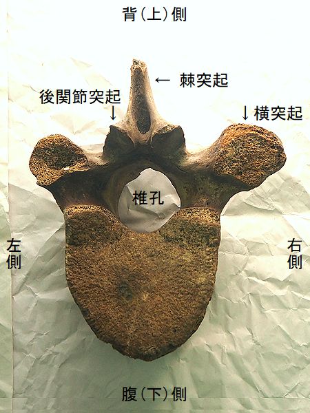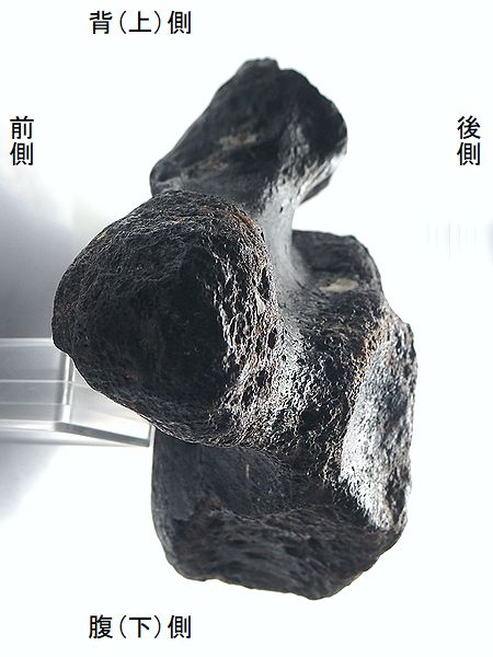 ヤフーオークションで購入。 胸椎の上に突出する棘突起であ る。先端部分が欠けている。脊 髄が通る椎孔の上半部の椎弓が 見られ、横突起の手前で両端が 折れている。棘突起の傾きは、 垂直に対し25°である。椎孔の 傾きや長さから、第4・5胸椎の 棘突起と思われる。 |