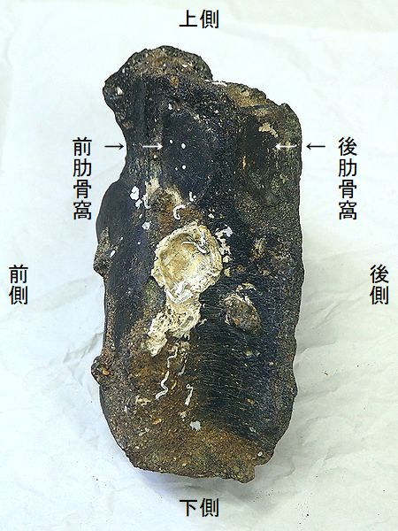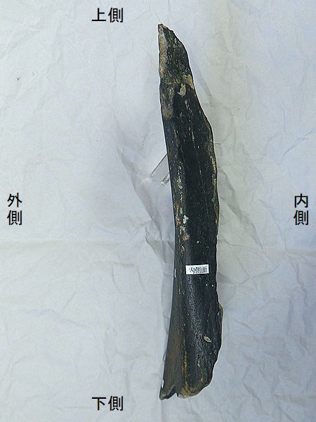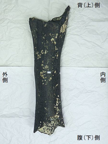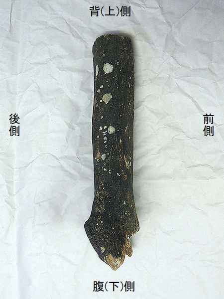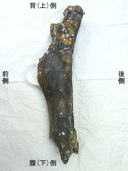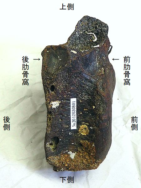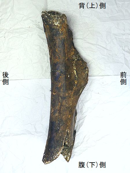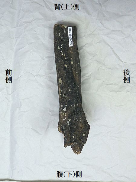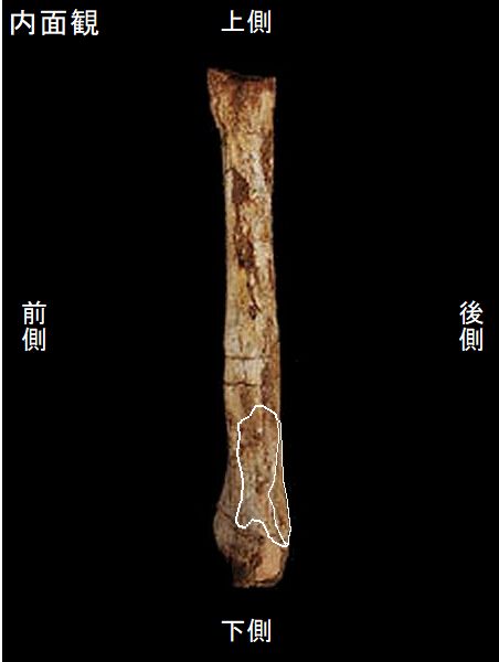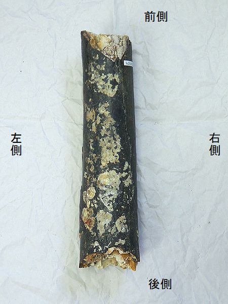 ヤフーオークションで購入。 上部の関節部分付近が欠け、下 部の関節の一部が残るが、大部 分が欠けている。左上腕骨の 全長の60%程が残っている。表 面や内部にカキなどの貝殻がか なり付着していた。表面は取り 除いた。骨の表面が剥がれたと ころもあり、内部の茶色の骨が 見えるところもある。 |