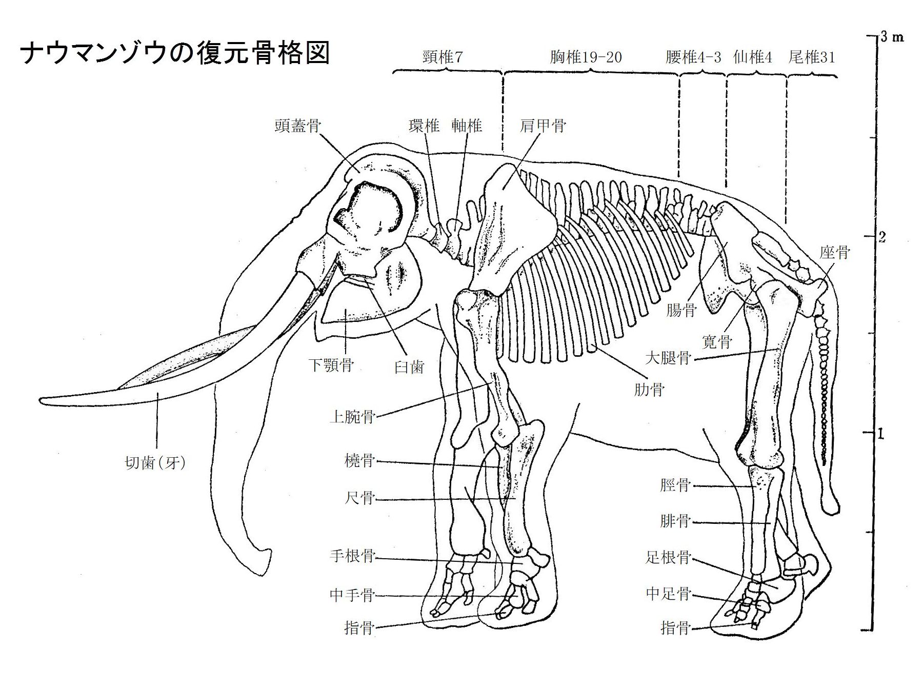 ナウマンゾウの復元全身骨格。地面から肩までの高さが 1.9m~2.7mで、現在のアジアゾウと同じぐらいか 一回り小さい程度の大きさである。頭頂部がベレー帽をかぶったようにふくらむ。背中を横から見ると肩と 腰の部分がやや高い。切歯(牙)は、オスが強く曲がってねじれ、最大直径15cm。メスは、まっすぐで短く、 直径6cmぐらい。 |