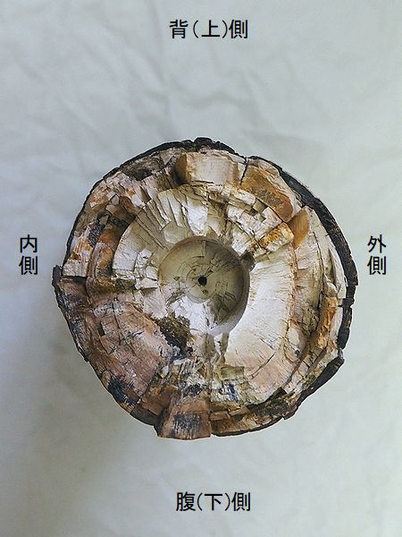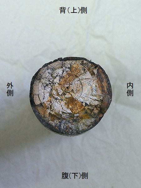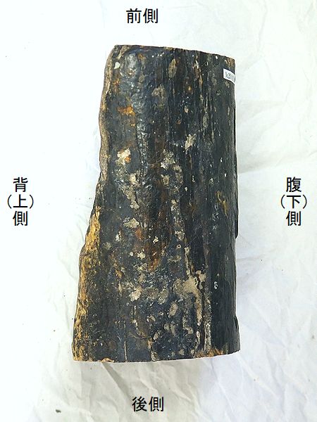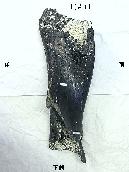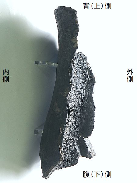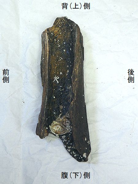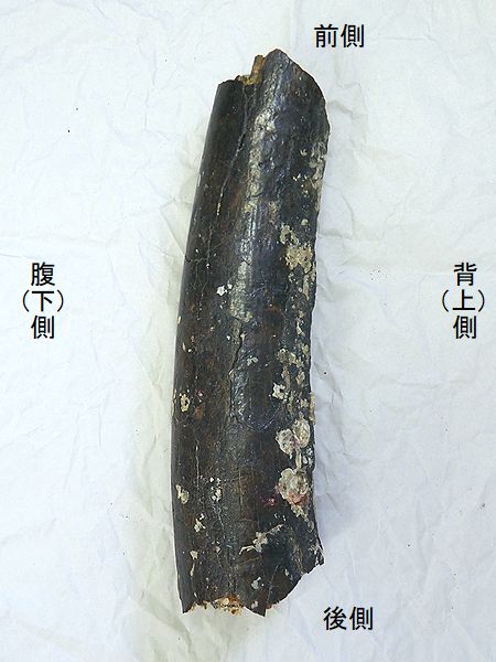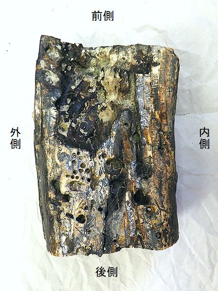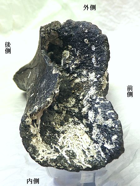 ヤフーオークションで購入。 上部と下部の関節部分付近が、 欠けている。上腕骨の全長の52 %程が残っている。全体が黒光 りし、骨は、金属音がするほど 石化している。表面や内部に現 生のカキやヘビガイがかなり付 着していた。表面の貝殻は除去 した。 |