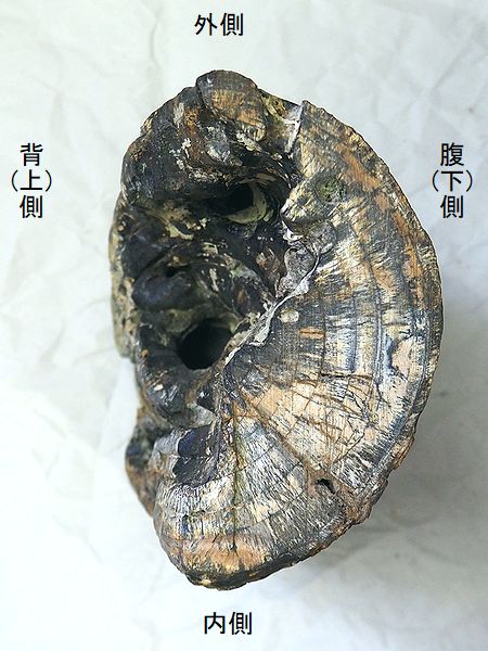 ヤフーオークションで購入。 牙の付け根の方は、歯髄腔の穴 が大きく、先端の方の穴は小さ い。どちらの面も人為的に平坦 に切断してある。自然に背(上) 面が削れ摩滅している。外側面 の曲がり具合から左側の牙と思 われる。穿孔貝の穴などもある ので、潮間帯あたりで削られた のかもしれない。 |
