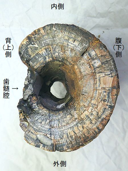 ヤフーオークションで購入。 切歯(牙)の部分化石である。牙 の前位の先端部分は、内側にね じれ、急に細くなるが、この標 本は、ほとんどねじれず、先も 急な変化はない。よって、太さ や曲がり具合から、右側の牙で、 先端より少し後の部分と思われ る。 |