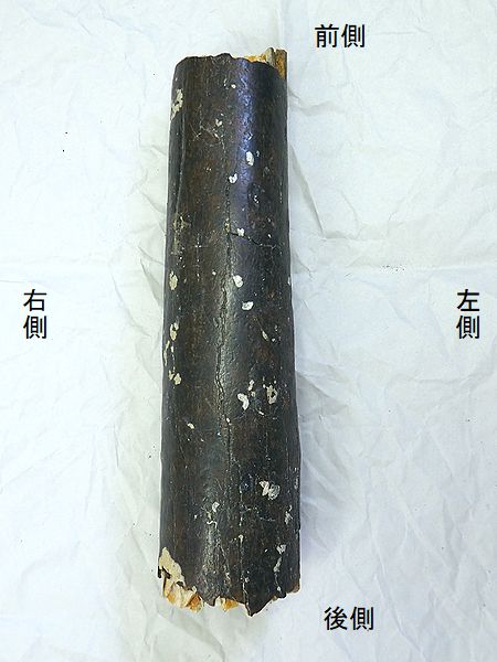 ヤフーオークションで購入。 右大腿骨である。上端の大転子 と大腿骨頭を欠く、下端の関節 部分も欠く。中空の骨である。 内部には、貝殻も付着している。 表面は、かなり硬化し、重い。 |