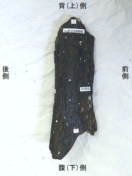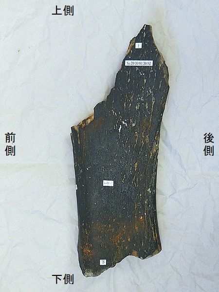ナウマンゾウ 右腓骨 Palaeoloxodon naumanni 香川県坂出市沖 第四紀更新世・30万年前 大槌島層 長さ:208mm、幅:74mm、 厚さ:36mm、 重さ:350g |