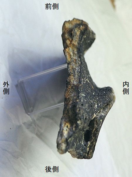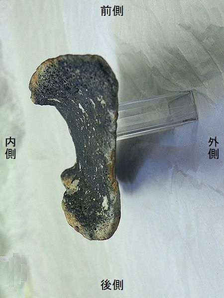 ヤフーオークションで購入。 右腓骨の破片である。下の半球 状にふくらむ外果の付け根部分 と思われる。上部3分の2が欠 けている。外果も欠けている。 外側面が残り、内側面の後部の 一部が残っている。 |