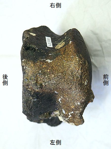 ナウマンゾウ 胸椎棘突起 Palaeoloxodon naumanni 明石海峡、瀬戸内海 第四紀更新世・30万年前 大槌島層 長さ:214mm、幅:107mm、 厚さ:50mm、 重さ:430g |