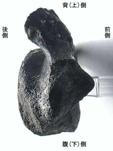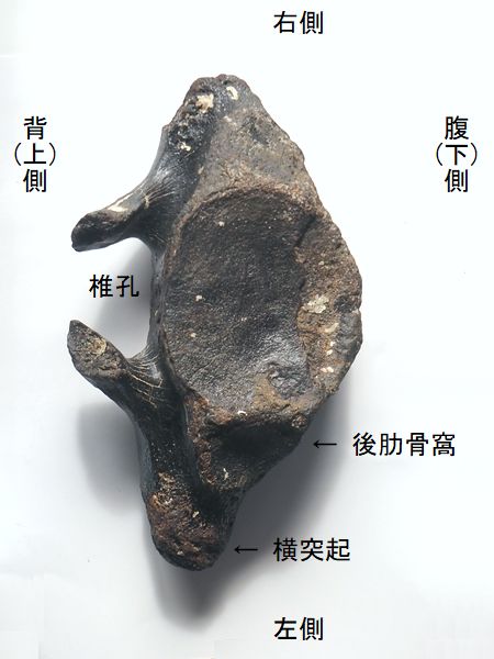 ヤフーオークションで購入。 横突起が椎窩のすぐ横から幅広 く出ている。椎頭や椎窩の形が やや横長の円である。棘突起や 関節突起を欠く。後肋骨窩が大 きく、第1~3胸椎あたりと思わ れる。黒光りした標本である。 石化がかなり進んであり、やや 小さいので、もしかするとステ ゴドンかもしれない。 |