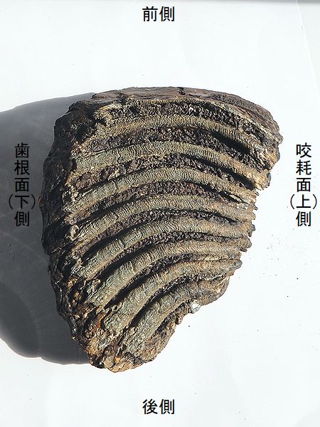 ヤフーオークションで購入。 咬耗面が凹み、ラメラが咬耗面 に直角なので下顎の歯である。 前側に続くラメラが剥がれてい るので、もっと長かったはずで ある。咬耗面側から見て頬側が 凹むので、左側の歯である。 後側のラメラは咬耗が進んでお らず。セメント質の充填もまだ なので、第3大臼歯と思われる。 |
