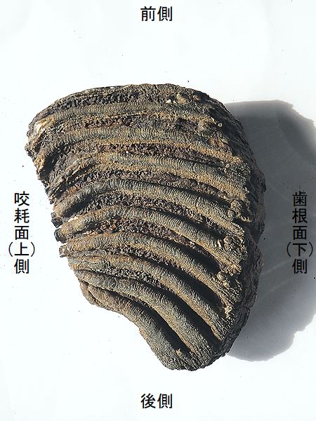 ナウマンゾウ 下顎左第3大臼歯 Palaeoloxodon naumanni 香川県小豆島地蔵埼沖 第四紀更新世・30万年前 大槌島層 長さ:182mm、高さ:135mm、 幅:66mm、 重さ:1.58Kg |