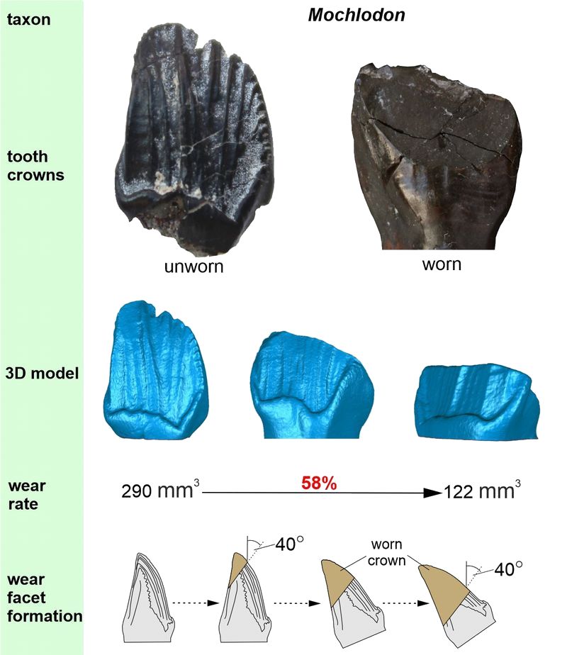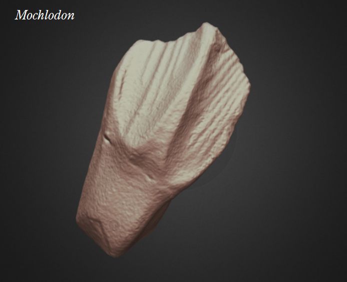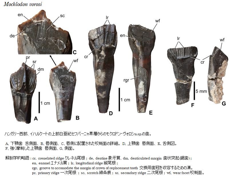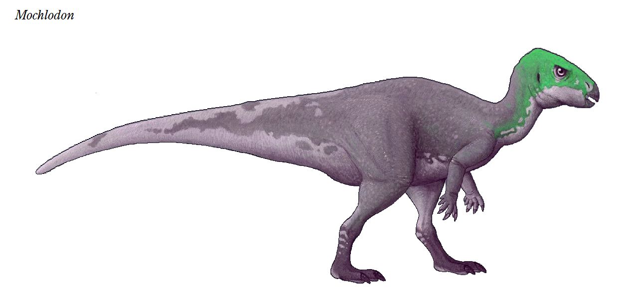 | モクロドンは、ハンガリー、ルーマニアの白亜紀後期(約8500万年前)の 地層から発見された。タイプ標本の化石は、部分的な下顎を備えた頭蓋骨 と、肩甲骨、尺骨、前肢指骨、大腿骨および脛骨などの部分的な骨格であ る。歯冠には、目立つ正中隆起があり、その前部には、5つの二次隆起が 歯冠の中央まで伸びている。上顎には、少なくとも13本、下顎には、少な くとも14本の歯があった。歯は、菱形で、帯状部があり、歯冠の付け根に 厚い縁を持っていた。手と足は、細身である。おそらく若年の骨格である。 全長は、1.6~1.8mほどと推定される。おそらく、通常、四足歩行の草食 恐竜だった。 |