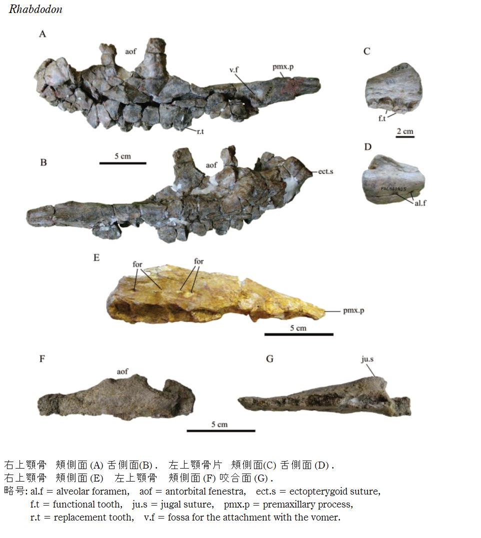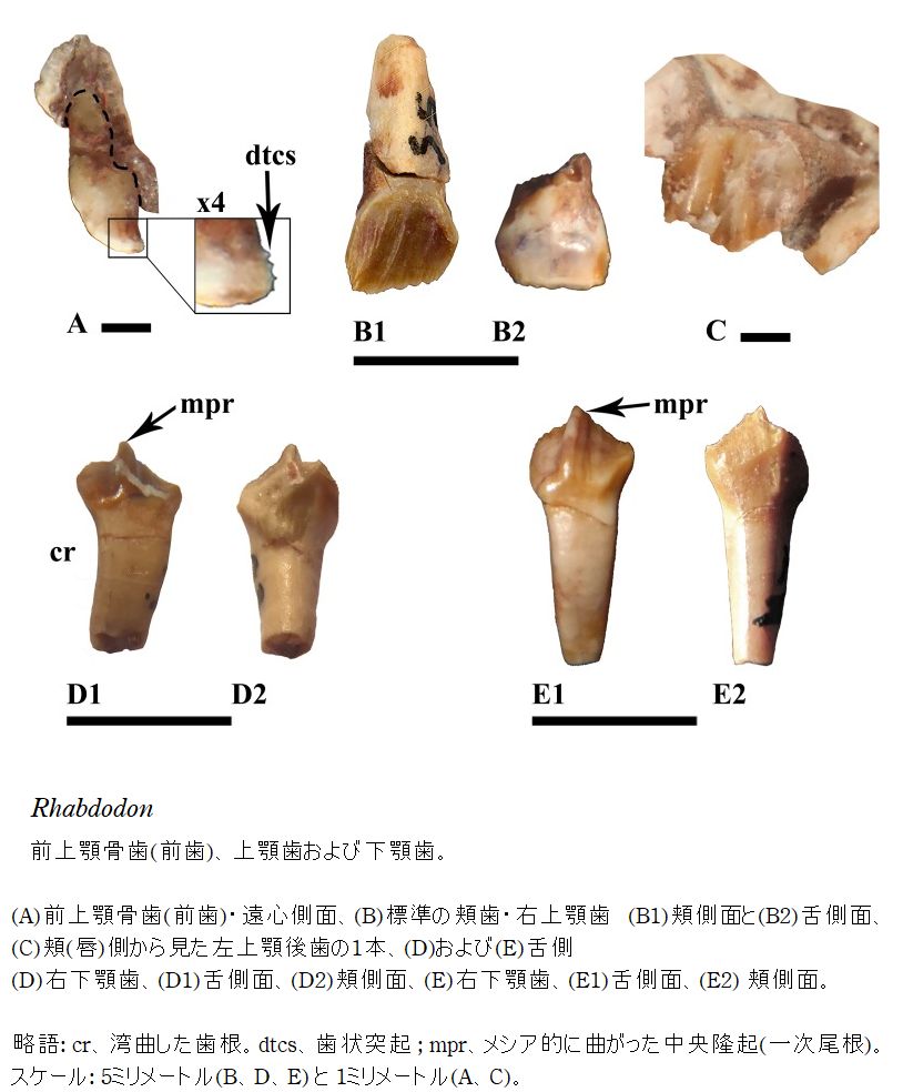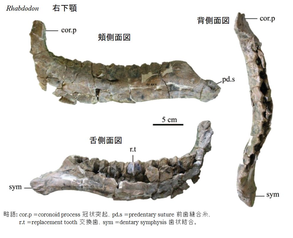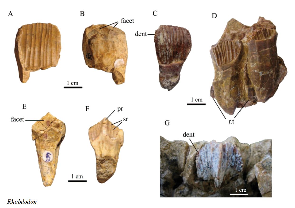 | ラブドドンの名前は、「溝のある歯」の意味である。ラブドドン科の歯は、上顎歯と 下顎歯の両方の極端な拡大を特徴とし、上顎歯数の大幅な減少と相関している。歯は、 強力なはさみのような剪断力のある葉の形(スペードの形状)である。前上顎骨には、 3つ以上の前歯が存在する。上顎歯と下顎歯の隆起パターンは、明確な違いがある。 歯冠には、歯の正中線に沿って隆起(中央隆起)がある。前縁と後縁の両方の先端付近 に尖った歯状突起(鋸歯)がある。歯冠のエナメル質表面には、縦溝が見られる。下顎 歯のエナメル質表面は、舌側にあり、逆に、上顎歯のエナメル質表面は、頬側にある。 咬合の仕方は、ハドロサウルスなどと同じで、下顎歯の頬側に上顎歯が滑り落ちるよ うに咬合する。そのため、下顎歯の頬側には、広い咬耗面が形成される。上顎歯は、 舌側に狭い咬耗面を形成する。 |