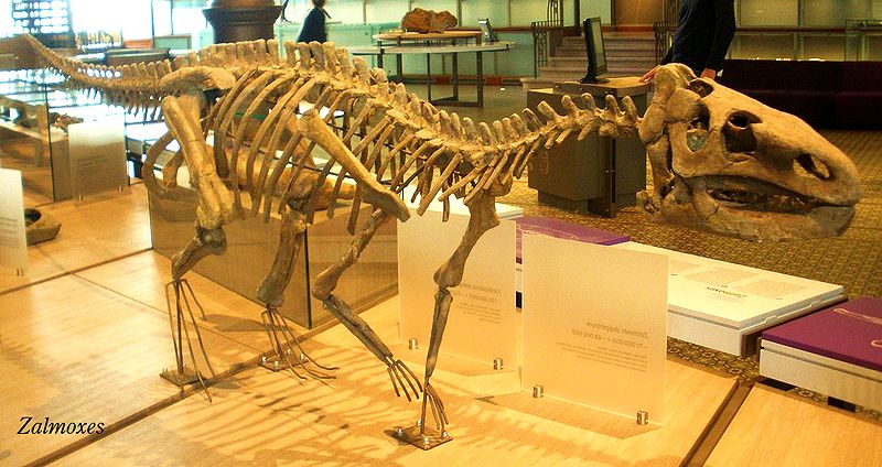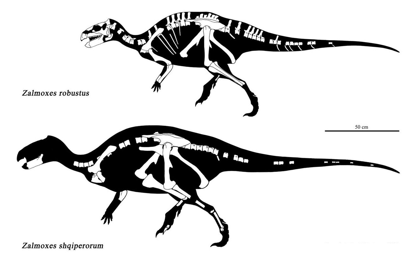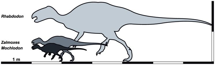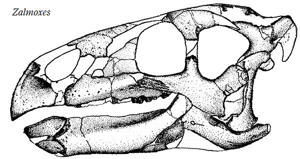 | ザルモックスは、ルーマニア、トランシルバニアの白亜紀後期(約7000万 年前)のサンペトル累層、セベス累層、デンスシュ・シウラ累層などから 発見された。化石は、頭蓋骨の約80%と、脊椎骨、仙骨、尾骨、手足を除 く肢骨などである。この属の標本は、1899年にモクロドンと命名された ものが、1915年にラブドドンに分類され、2003年にタイプ種、ザルモッ クスに再分類された変遷がある。大きな三角形の頭とくちばしを持つ二足 歩行の草食恐竜である。全長は、約2~2.5m、体重は、45Kgほどと推定 される。 |