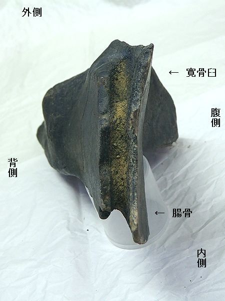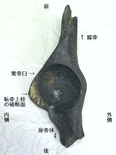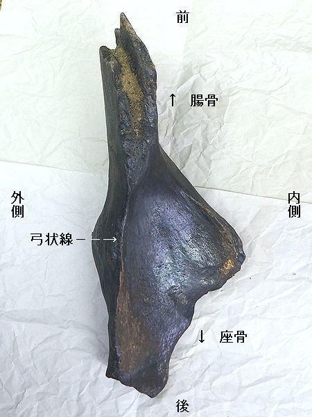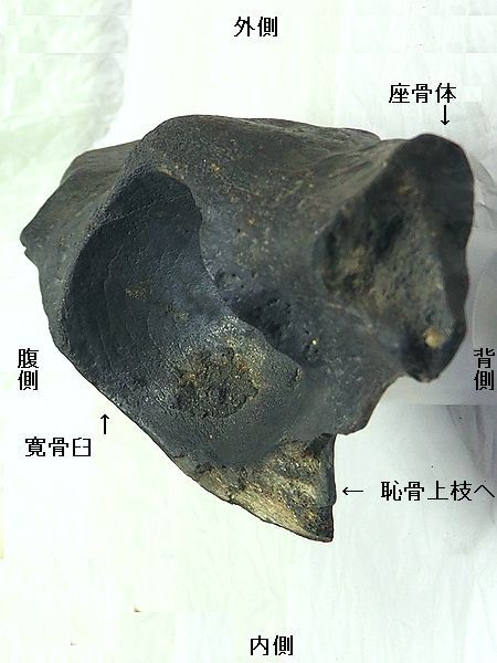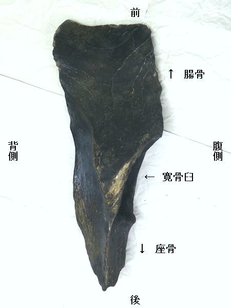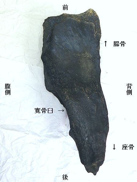 | ステゴドン(アケボノゾウ)の腰の骨「狭山 市立博物館」。腰の骨は、左側の「腸骨」と寛 骨臼に大腿骨を関節する中央の「寛骨」、右 側の「座骨」と一体になっている。標本No. 2018070801の標本は、黒い点線(濃:手前 、薄:奥)で仕切られた部分の「左寛骨」の部 分骨である。 |