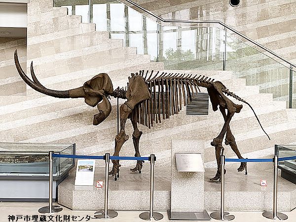 ステゴドンの全身骨格。神戸市埋蔵文化財セ ンターに展示してある。兵庫県の明石海峡付 近の海底からステゴドンの化石が地引き網等 によって引き上げられている。切歯(牙)が、ナ ウマンゾウほど内側にねじれず、緩やかに上 方に曲がっている。 |