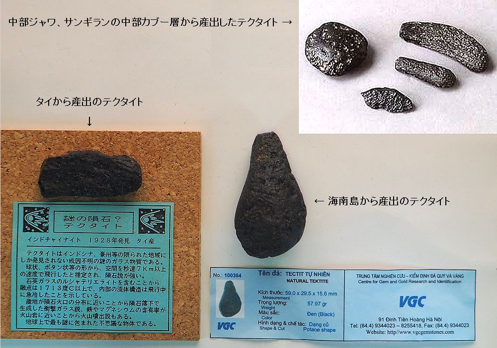 | 左は、東京の恐竜展で購入したテクタイトで、 扁平な長楕円体である。ややゆっくり回転しな がら飛翔したと考えられる。右下は、ベトナム 旅行のハノイの土産物店で購入したテクタイト である。液滴状の形であり、かなり高速回転で 飛翔した際にできる形らしい。右上は、インドネ シア・中部ジャワ・サンギラン地域のカブー層か ら産出したテクタイトである。 |
