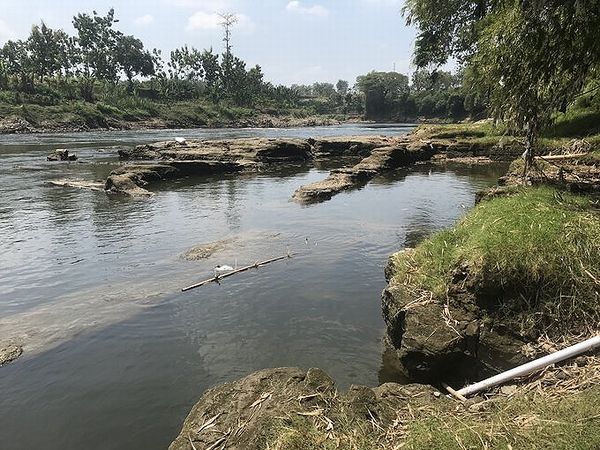 インドネシア・中部ジャワ・トリニールの ジャワ原人(ホモ・エレクトス)発掘地。 オランダの若い解剖学者デュボアが、1891 年にトリニールのソロ川沿いの地層を発掘 し、多くの哺乳類化石とともに最初のジャ ワ原人の頭骨片を発見した場所である。 ソロ川は、乾期に水位が下がり、写真の中 央付近の川底が露出した。 |
