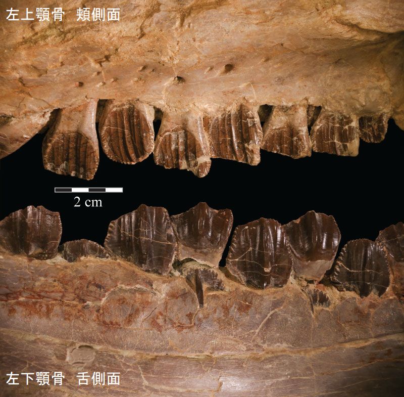 | テノントサウルスの頬歯は、厚みがあり、イグアノドンの歯に似ているが、歯冠高に 対する歯冠幅が広いようである。歯は、横1列に隙間無く並ぶ。歯冠には、前縁と後 縁の両方の先端付近に尖った鋸歯がある。歯冠中央付近の幅が広く、先端に向かって 狭くなる。また、歯根に向かっても狭くなる。歯冠のエナメル質表面には、縦溝が見 られ、中央隆起が顕著である。下顎歯の中央隆起のあるエナメル質表面は、舌側にあ り、逆に、上顎歯の中央隆起のあるエナメル質表面は、頬側にある。咬合の仕方は、 ハドロサウルスなどと同じで、下顎歯の頬側に上顎歯が滑り落ちるように咬合する。 そのため、下顎歯の頬側には、広い咬耗面が形成される。上顎歯は、舌側に狭い咬耗 面を形成する。 |