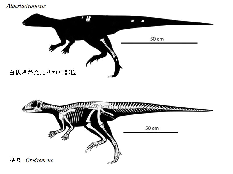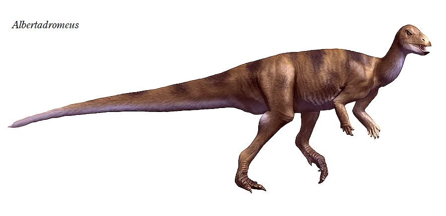 | アルバータドロメウスの化石は、カナダ、アルバータ州、カナルクリーク 地域の白亜紀後期(約7700万年前)のオールドマン累層上部から発見され た。化石は、頭蓋骨を欠き、2つの胴椎、尾椎、頸肋骨、骨化した腱、左脛 骨と腓骨、不完全な右腓骨、および断片的な中足骨と爪であった。遠位 腓骨が遠位脛骨に融合している。全長は、約1.5mであったと推定されて いる。二足歩行で、小型でおそらく速く走る草食恐竜だった。 |